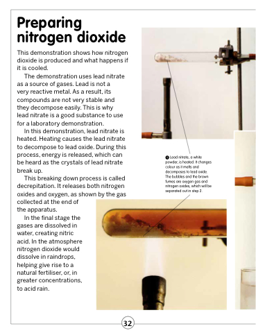 Lead nitrate, a white powder, is heated. It changes colour as it melts and decomposes to lead oxide. The bubbles and the brown fumes are oxygen gas and nitrogen oxides, which will be separated out in step 2.