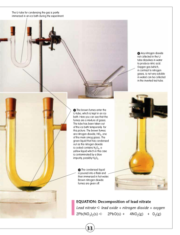 The brown fumes enter the U-tube, which is kept in an ice bath. Here you can see that the fumes are a mixture of gases. The tube has been taken out