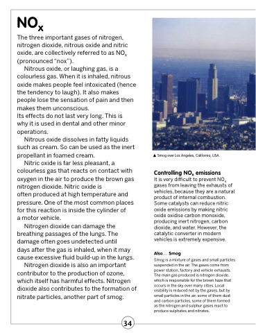 Smog is a mixture of gases and small particles suspended in the air. The gases come from power station, factory and vehicle exhausts. The main gas produced is nitrogen dioxide, which is responsible for the brown haze that occurs in the sky over many cities. Local visibility is reduced not by the gases, but by small particles in the air, some of them dust and carbon particles, some of them formed
