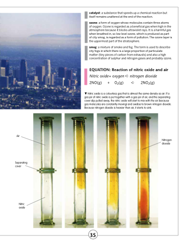 Nitric oxide is a colourless gas that is almost the same density as air. If a gas jar of nitric oxide is put together with a gas jar of air, and the separating cover slip pulled away, the nitric oxide will start to mix with the air (because gas molecules are constantly moving) and oxidise to brown nitrogen dioxide. Because nitrogen dioxide is heavier than air, it starts to sink.