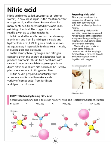 Nitric acid is prepared industrially from ammonia, and is used to make a wide variety of compounds, from fertilisers and dyes to explosives.