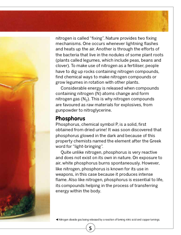 nitrogen is called “fixing”. Nature provides two fixing mechanisms. One occurs whenever lightning flashes and heats up the air. Another is through the efforts of the bacteria that live in the nodules of some plant roots (plants called legumes, which include peas, beans and clover). To make use of nitrogen as a fertiliser, people have to dig up rocks containing nitrogen compounds, find chemical ways to make nitrogen compounds or grow legumes in rotation with other plants.