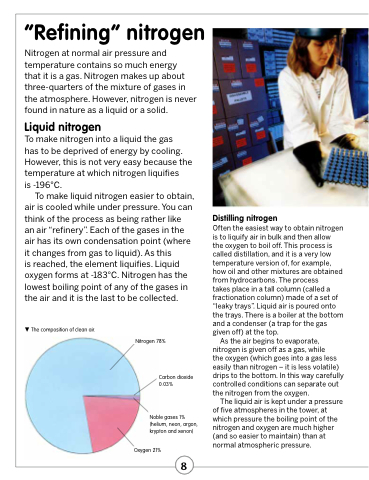 the oxygen (which goes into a gas less easily than nitrogen – it is less volatile) drips to the bottom. In this way carefully controlled conditions can separate out the nitrogen from the oxygen.