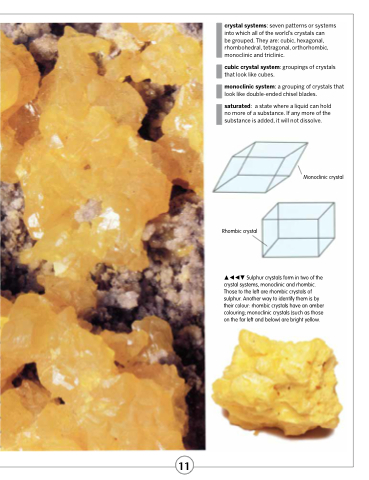 Sulphur crystals form in two of the crystal systems, monoclinic and rhombic. Those to the left are rhombic crystals of sulphur. Another way to identify them is by their colour: rhombic crystals have an amber colouring; monoclinic crystals (such as those on the far left and below) are bright yellow.