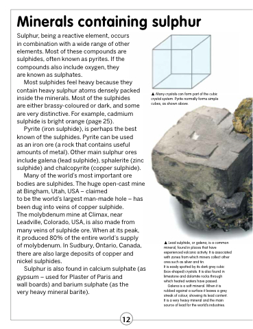 as an iron ore (a rock that contains useful amounts of metal). Other main sulphur ores include galena (lead sulphide), sphalerite (zinc sulphide) and chalcopyrite (copper sulphide).