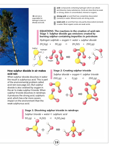 the air to make sulphur trioxide. When sulphur trioxide dissolves in raindrops it produces the strong acid, sulphuric acid, which has a far more severe impact on the environment than the weak sulphurous acid.