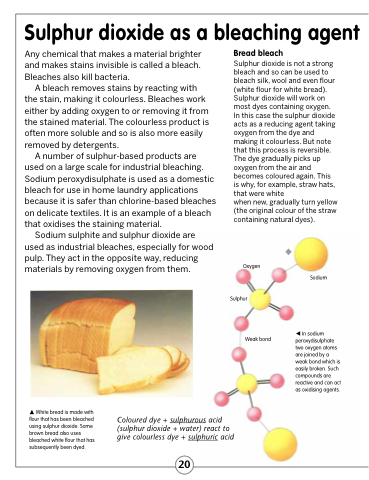 Sulphur dioxide is not a strong bleach and so can be used to bleach silk, wool and even flour (white flour for white bread). Sulphur dioxide will work on most dyes containing oxygen. In this case the sulphur dioxide acts as a reducing agent taking