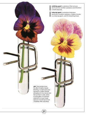 the effect of sulphur dioxide bleaching. A purple pansy was exposed to a sulphur dioxide atmosphere for two minutes and then put back in water, where