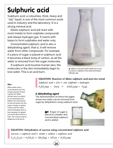 The demonstration on these two pages shows how water can be removed from sugar by dehydration using sulphuric acid.