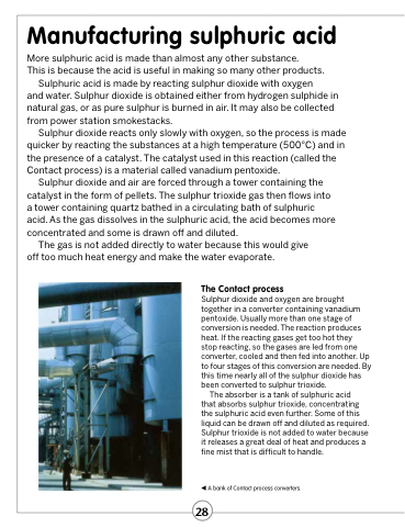 that absorbs sulphur trioxide, concentrating the sulphuric acid even further. Some of this liquid can be drawn off and diluted as required. Sulphur trioxide is not added to water because it releases a great deal of heat and produces a fine mist that is difficult to handle.