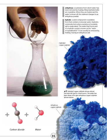 Hydrated copper sulphate (shown above) has been left next to a heat source. The water has been driven off to give anhydrous copper sulphate (shown below).