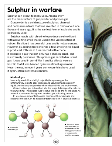 is extremely poisonous. This poison gas is called mustard gas. It was used in World War I, and its effects were so horrific that it was banned by international agreement. Nevertheless, in recent years some countries have used