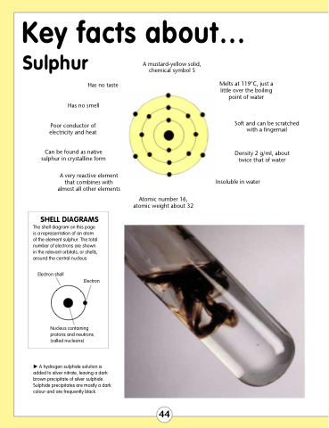 The shell diagram on this page is a representation of an atom of the element sulphur. The total number of electrons are shown in the relevant orbitals, or shells, around the central nucleus.