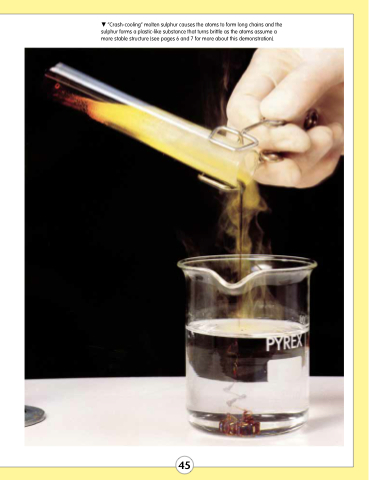 “Crash-cooling” molten sulphur causes the atoms to form long chains and the sulphur forms a plastic-like substance that turns brittle as the atoms assume a more stable structure (see pages 6 and 7 for more about this demonstration). 45