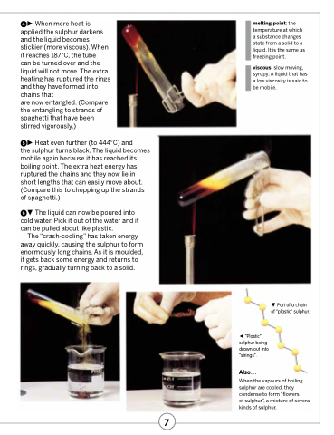 the sulphur turns black. The liquid becomes mobile again because it has reached its boiling point. The extra heat energy has ruptured the chains and they now lie in short lengths that can easily move about. (Compare this to chopping up the strands of spaghetti.)