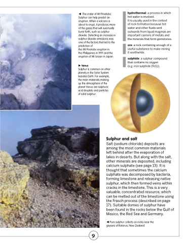 lakes in deserts. But along with the salt, other minerals are deposited, including calcium sulphate (see page 13). It is thought that sometimes the calcium sulphate was decomposed by bacteria, forming limestone and releasing native sulphur, which then formed veins within cracks in the limestone. This is a very valuable, concentrated resource, which can be melted out of the limestone using the Frasch process (described on page 17). Suitable domes of sulphur have been found in the rocks below the Gulf of Mexico, the Red Sea and Germany.