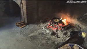 Shows a Victorian age meal and kitchen garden, including cooking over an open indoor fire.