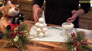 Shows how to hand-make Christmas table decorations using cones and meringes. This is a copy of a trditional table decoration using candles for period authenticity. Make sure you follow the instruction to use safety LED lights instead.