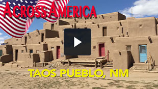 Show the Taos Pueblo, a village of Native Americans on the edge of the Rio Grande valley in the mountains of New Mexico. The buildings are made of adobe, a kind of mud brick, in a traditional style.