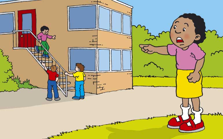 Gabriella looks across the playground and sees some older boys playing on the stairs.