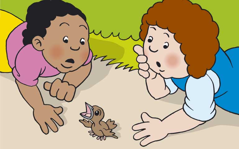 Suddenly they spot a baby bird that has fallen out of a nest in the hedge.