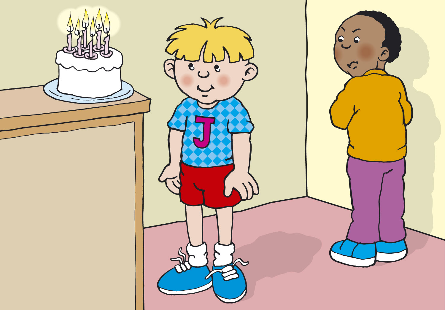 It's Friday and the birthday cake is on the piano. Jamie has a birthday this week, so he is asked to blow out the candles.