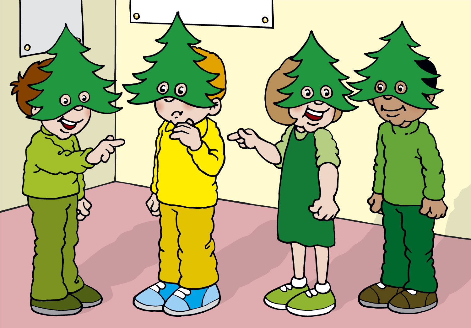 The teacher tells all of the 'trees' to come to the next day's rehersal with green clothes on.