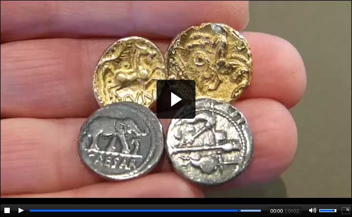 Shows replica aureus coins, which were originally made from gold and worth twenty-five silver denarii.