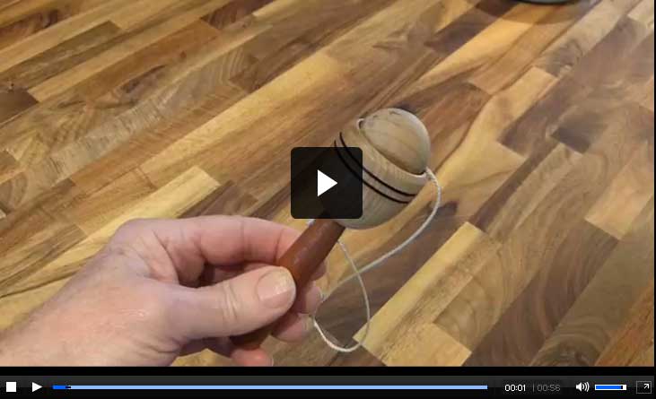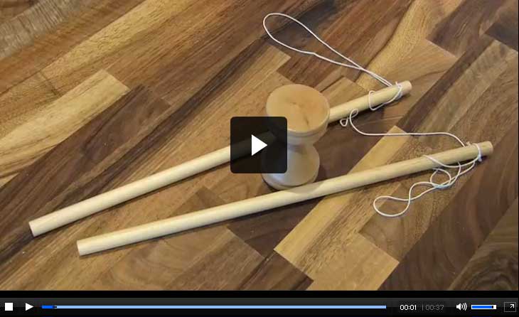The aim with a diablo is to use the wooden sticks to spin a 'dumbbell' on the string until it is going fast enough to be thrown into the air and caught again on the string.