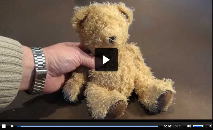 A replica teddy bear of the type invented in late Victorian times. Originals were made from goat's wool.