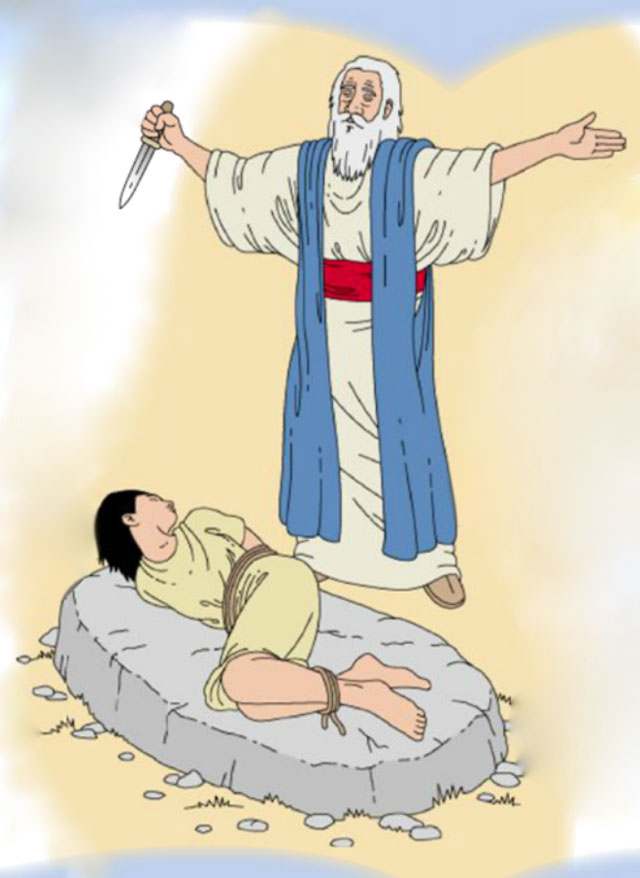 When Isaac was still a boy, God told Abraham to sacrifice his son at an altar on a mountaintop. Abraham was tearful, but he knew he must obey God's will. Just before Abraham sacrificed Isaac, God spoke to Abraham and told him to sacrifice a sheep instead. God had been testing the strength of Abraham's faith, and he had passed.