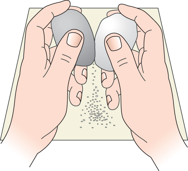 During a storm, breaking waves can throw sand and sometimes pebbles against cliffs. At the same time the sand and pebbles bump together as they are rolled about by the waves on the beach, making them finer and more rounded. This is called attrition. This is how pebbles become worn down to sand.