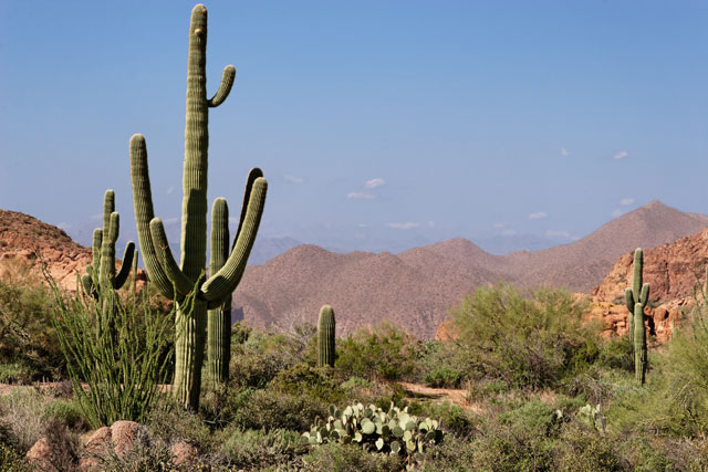 This is a video of a roadrunner bird in a desert. It doesn't need to drink at all, but gets its moisture from the blood (which is nearly all water) in the food it eats. Its food, such as lizards, can get moisture from dew over night, and from the animals and plants they eat. The plants, on which all of this depends, hold on to the moisture they get in occasional rainstorms by storing it in their big stems.