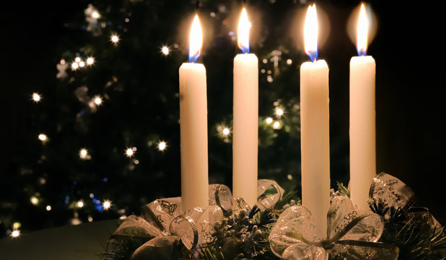 Candles in a wreath that display the Christmas season.