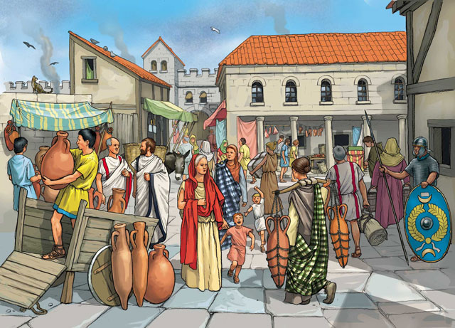 A busy Roman agora, filled with traders and customers.