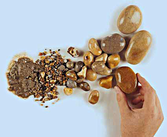 The picture above shows you that a great many sizes of material that can be called alluvium are carried by a river. The smallest pieces that you can see individually here are sand. The fine material around the sand is silt and mud.