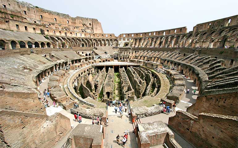 The Colosseum in Rome is the largest Roman theatre-in-the-round. It is one of the world’s most famous buildings, and it is now two thousand years old.