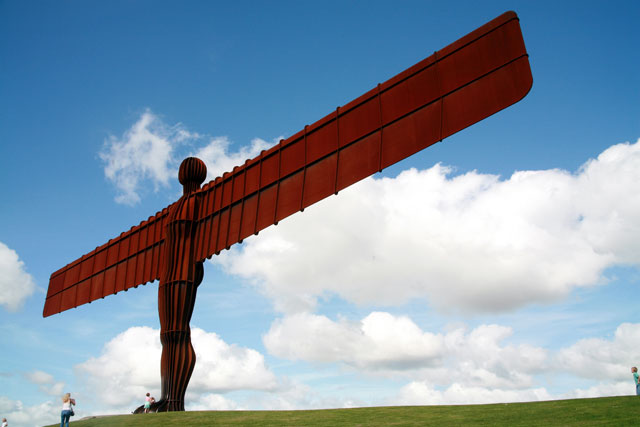 The Angel of the North, a sculpture by artist Antony Gormley, in Gateshead, England. It is 20m tall, and has wings that are 54m across.
