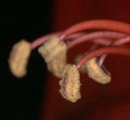When the pollen grains are ready to be released the anther breaks open and turns itself inside out, so that the pollen grains are exposed to either insects or wind.