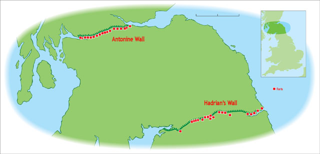 A map of Britain showing Emperor Hadrian's wall, and the site of Emperor Antoninus Pius' wall.