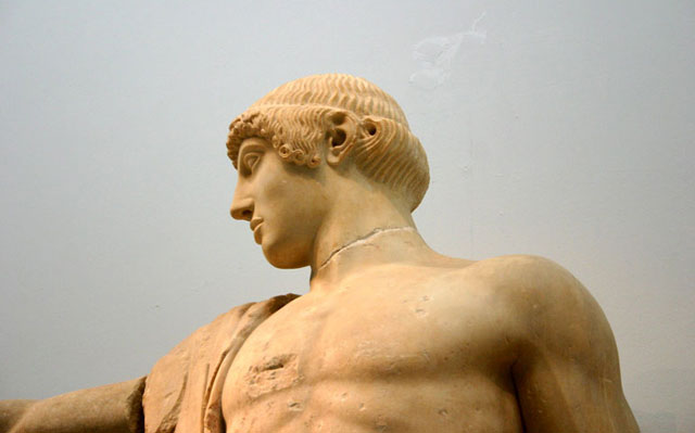Apollon was worshipped throughout the Greek world. Every four years they held the Pythian (serpent) Games in his honour at Delphi. Apollon is usually shown as a handsome young man, clean shaven and carrying either a lyre, or his bow and arrows. There are many sculptures of Apollon and one of the most famous is the central figure of the Temple of Zeus, at Olympia (the one you see in the picture above).