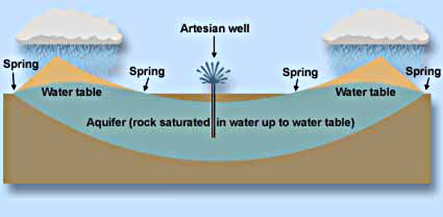 How an aquifer works. If water is trapped underground in an aquifer it is called artesian water and it comes to the surface under pressure if a bore hole is drilled.