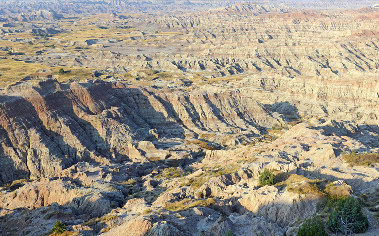 Badlands landscape, formed by deposition and erosion by wind and water, contains some of the richest fossil beds in the world, Badlands National Park, South Dakota, USA.