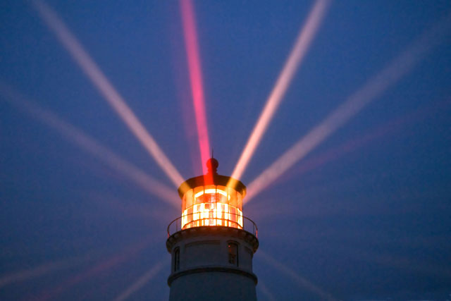 A lighthouse with beams of light coming from its bulb to warn ships of the position of the coast.