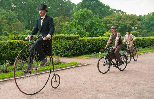 But it was very difficult to steer a machine where the pedals were on the front wheel as well. To get a bit more speed, the front wheel was made larger, and this is how the penny-farthing was invented. However, getting on and off a penny-farthing was a challenge.
