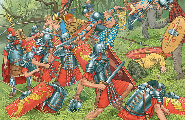 Caractacus and the Celtic warriors defending Britain against the invading Roman infantry.