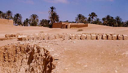 Bricks being made from sun-dried clay. The clay was dug from the pit on the left. These kind of bricks are called adobe. Most bricks go through a further stage of heating to make them stronger.