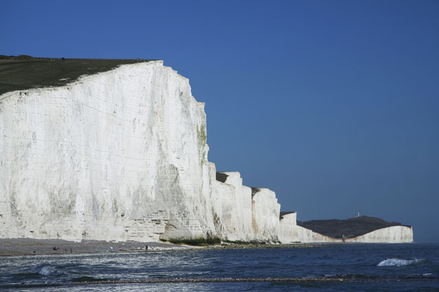The shape of the cliff depends on the rock it is made from. The White Cliffs of Dover, for example, are made of chalk which has no lines of weakness, and is one thick band of the same rock. The cliffs at Whitby look more like a flight of stairs because they are formed by many thin bands of rock. Some bands of rock are hard and others soft. The hard bands stand out as thin ledges (the risers of the staircase) while the soft rocks wear back more easily (the treads of the staircase).