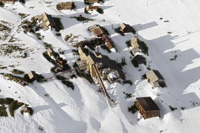 Snow covered buildings in California.
