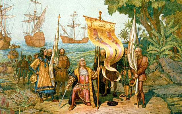 On Friday they arrived at a small island called, in the language of the Indians, Guanahani. Presently they saw naked people. [Columbus] went onshore in the armed boat, and Martin Alonso Pinzon, and Vicente Yanez, his brother, who was captain of the Niña. [Columbus] took the royal standard, and the captains went with two banners of the green cross, which [Columbus] took in all the ships as a sign, with an F and a Y and a crown over each letter, one on one side of the cross and the other on the other.